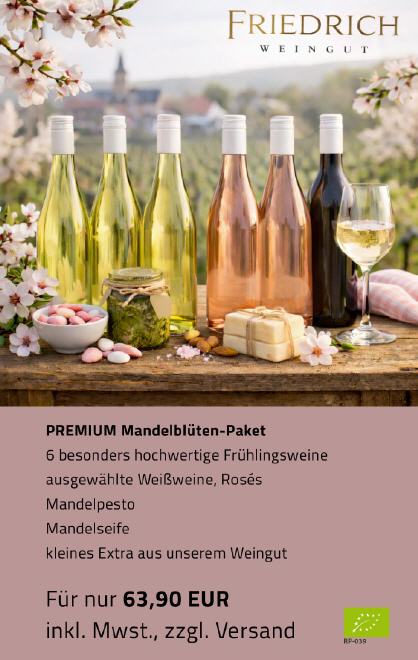 Wenn in der Pfalz die Mandelbäume blühen, beginnt eine der schönsten Zeiten des Jahres. Zarte rosa Blüten, die ersten warmen Sonnenstrahlen und endlich wieder Weinmomente im Freien. Genau dieses Gefühl haben wir in unserem Mandelblüten-Weinpaket eingefangen.
